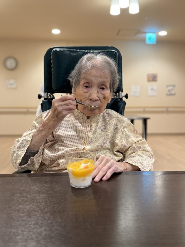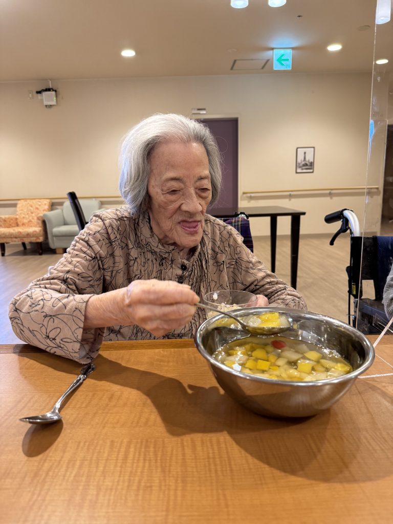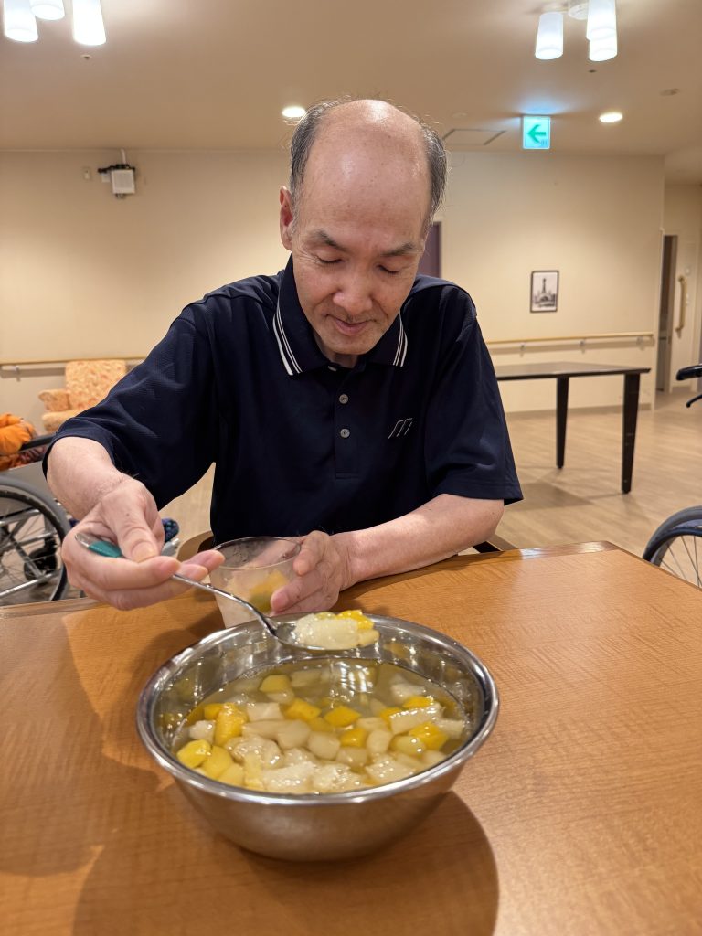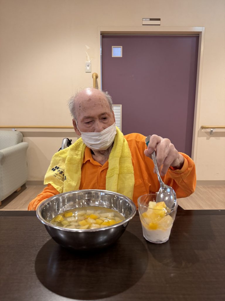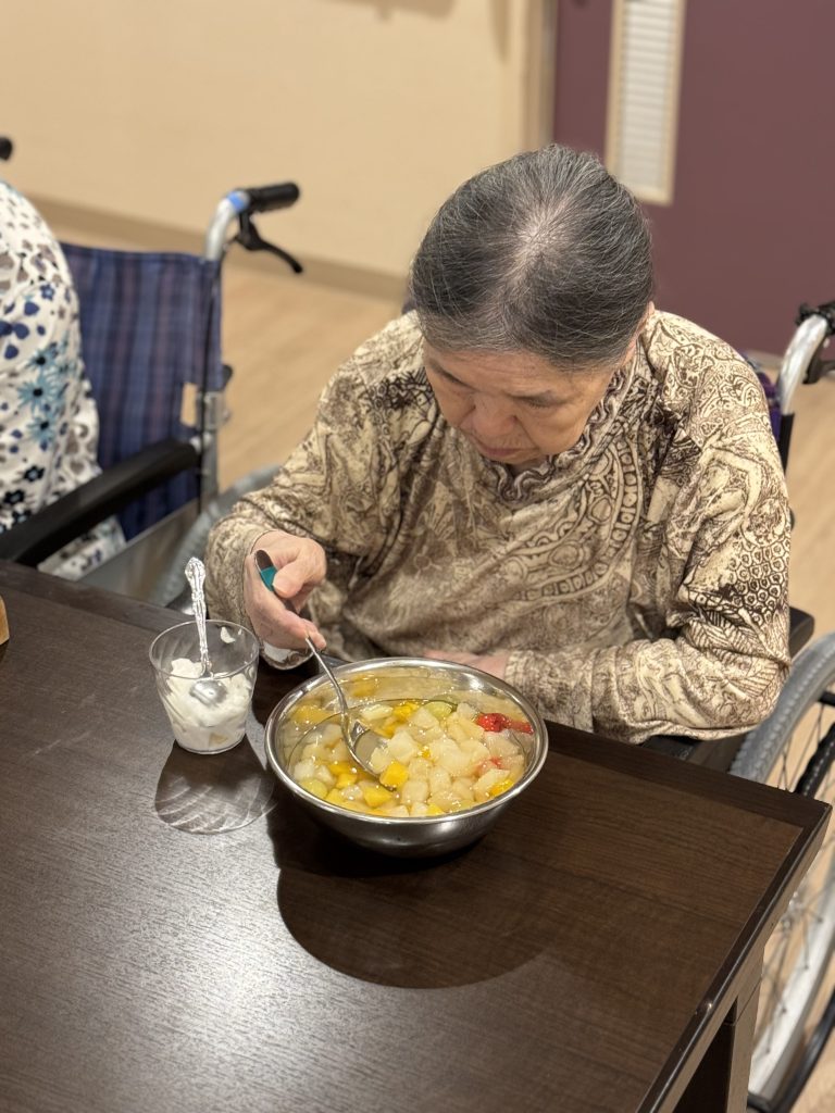3階の皆様から「またしてくれ」と熱い要望があったフルーチェを開催させていただきました。 ミカンや桃やパイナップルのトッピングも思い思いに楽しまれていました「こんなに載せていいの」「入れ物一杯に入れるで」と言われながら盛り付けておられました。 出来上がりを「美味しいわ、また絶対にしてや」と大変喜んでいただけました。